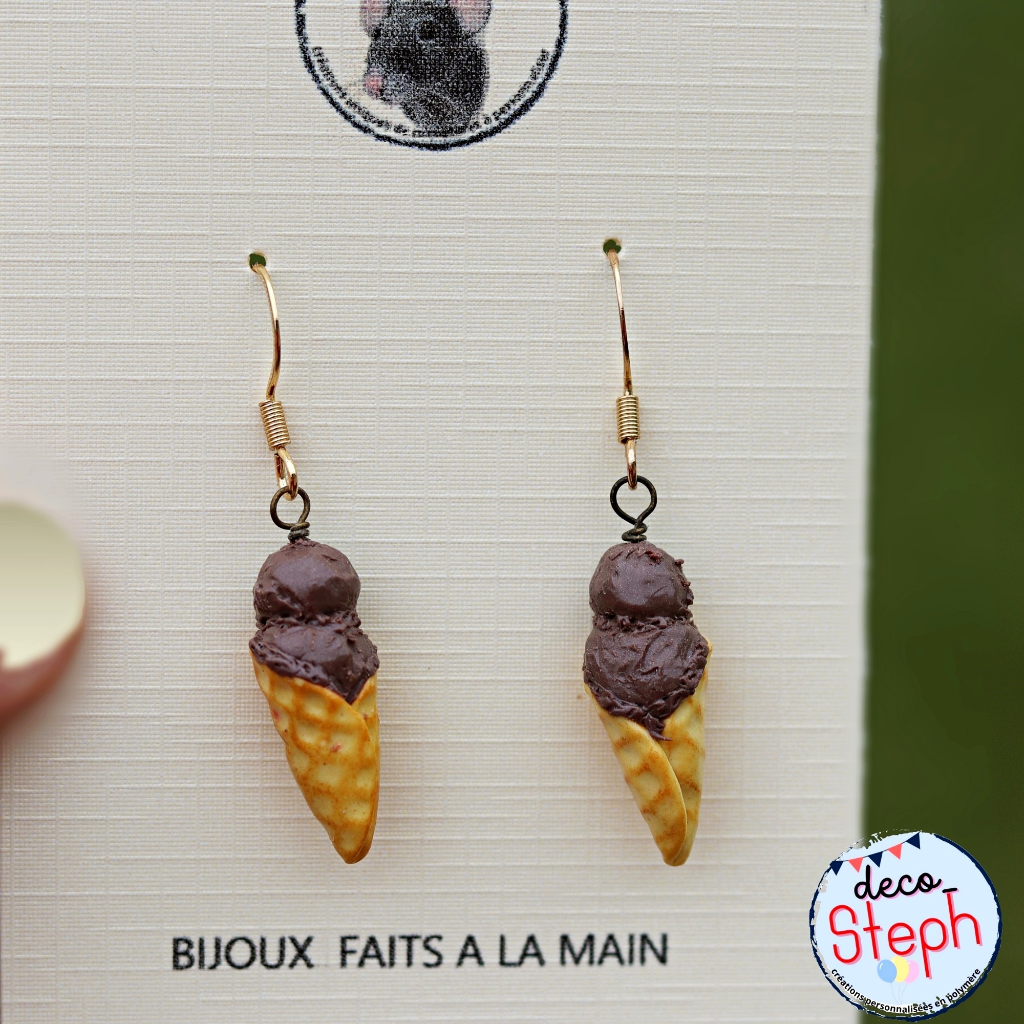 Boucles d’oreilles Cornet de Glace Vanille – Bijoux Gourmands Fait Main en Argile Polymère