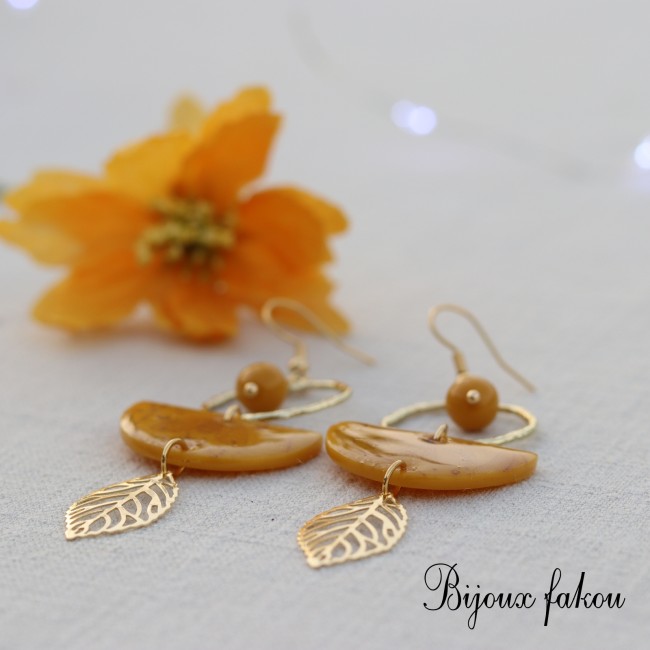 Elles associent une demi-lune couleur ocre aux motifs discrets, montée sur un anneau doré texturé et agrémentée d’une petite perle assortie.