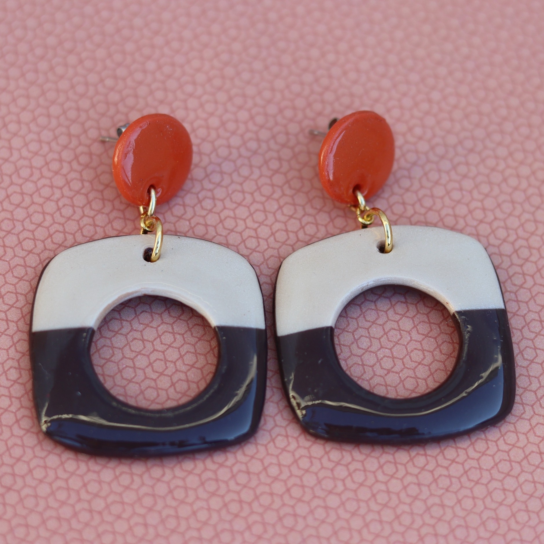 Cette paire associe les formes géométriques modernes à des couleurs chaleureuses des années 70 ! Terracota, beige et chocolat. J'ai creusé un rond dans une pièce carré pour alléger l'ensemble en gardant l'esprit des motifs des années seventies.