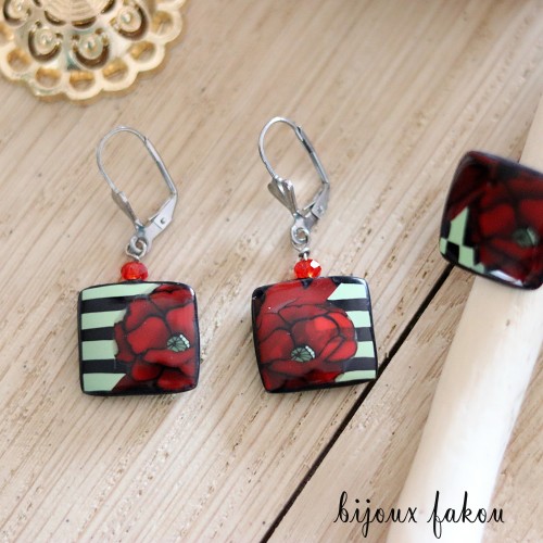 boucles carré motif coquelicot pendantes attache dormeuses en inox argenté